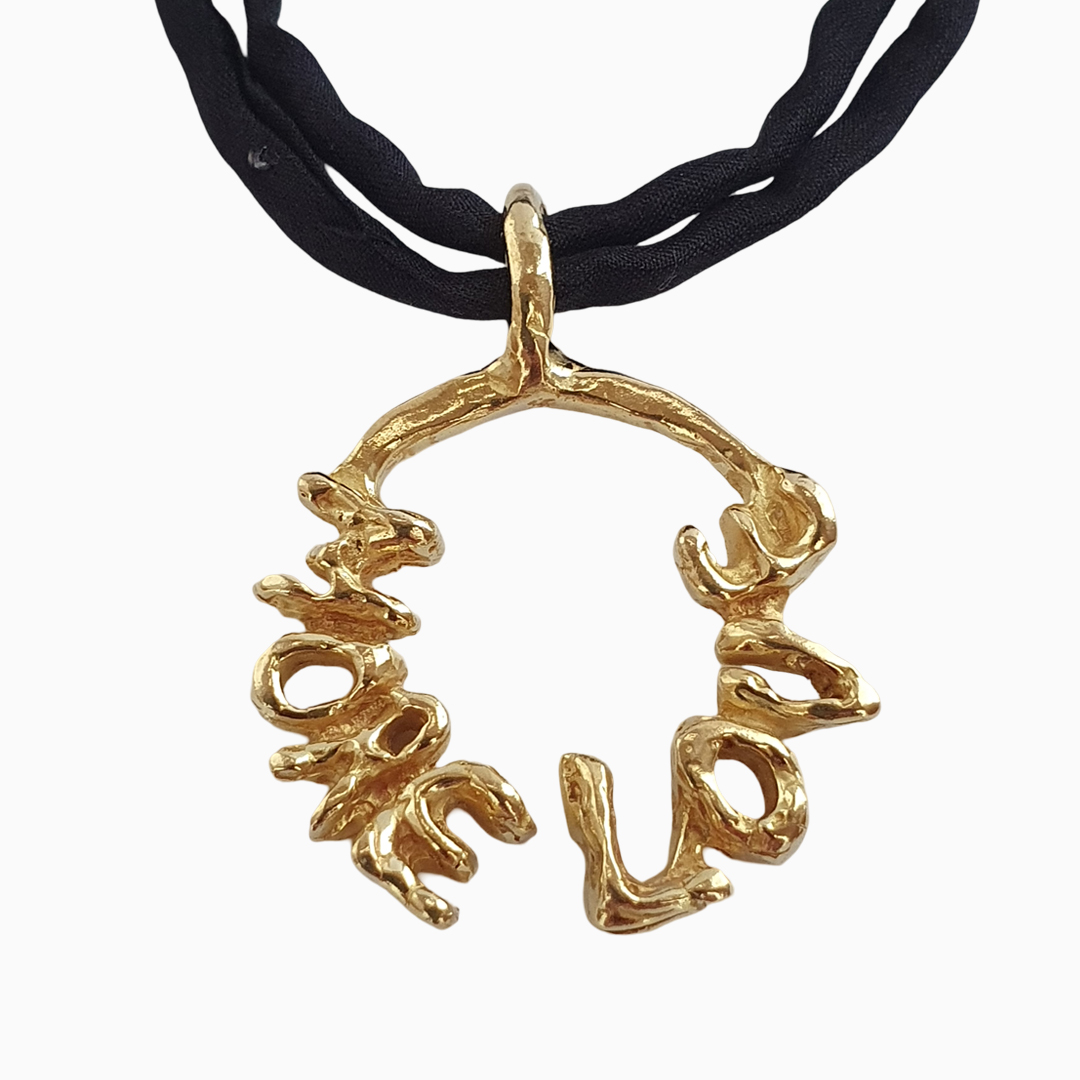 The Más Amor pendant, a unique and eye-catching piece of jewelry. Its bold, organic design and the words etched into the metal express your love for yourself and others, serving as a reminder to always choose love.